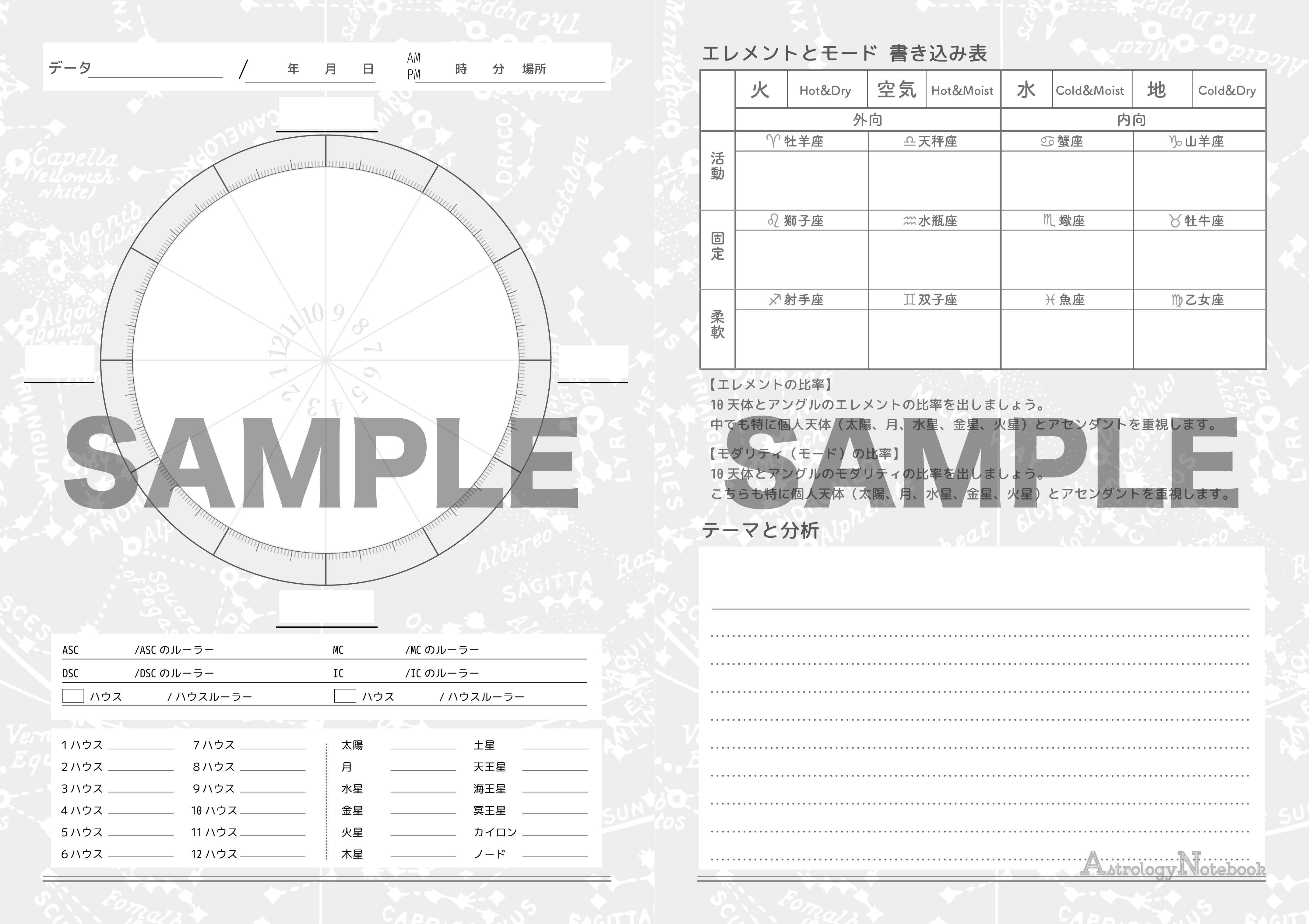 今まで手書きでざっくりと円を書いたり、出力したコピーを貼り付けるなど、苦労しながらホロスコープをメモしていた人も、これならマークやデータを書き込むだけですぐに記録に残すことができます。